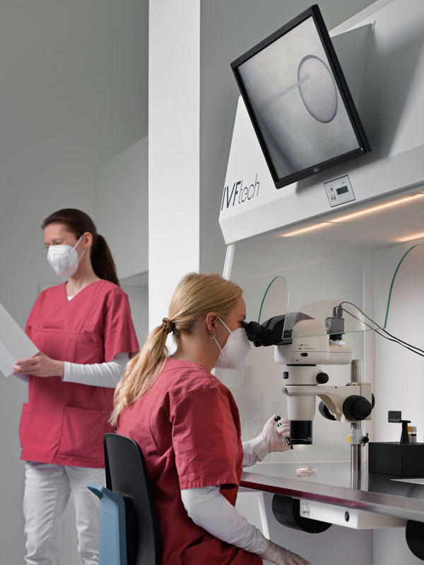 Die eigentlichen Methoden der künstlichen Befruchtung, die außerhalb des weiblichen Körpers in unserem embryologischen Labor stattfindet, sind die „normale“ In-Vitro-Fertilisation (IVF) und die „erweiterte“ In-Vitro-Fertilisation mit einer Mikroinjektion von Spermien in die Eizelle (ICSI = Intrazytoplasmatische Spermieninjektion). Erstere kommt zum Beispiel bei einem Eileiterverschluss oder einer Endometriose in Betracht, die zweite wiederum bei einer deutlichen Minderung der Samenqualität.